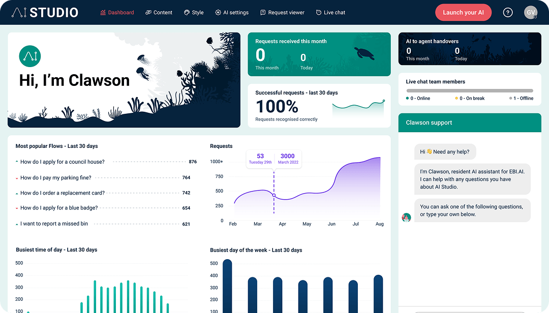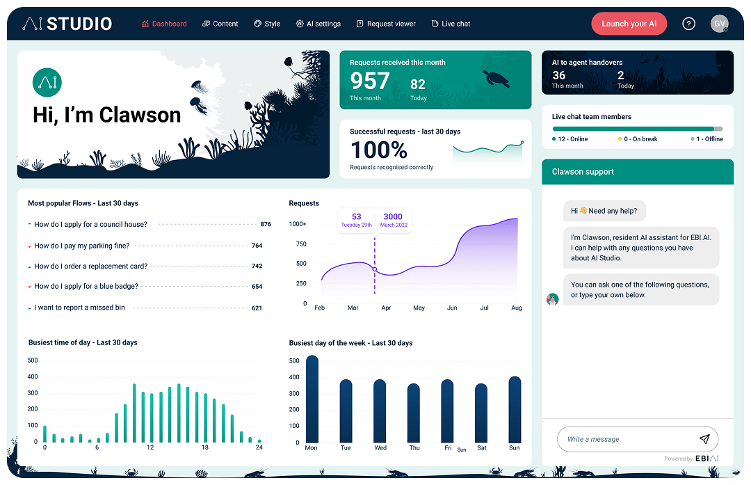 Built tools for training and optimizing the AI assistant, including insights into common queries, resolution rates, and user engagement.